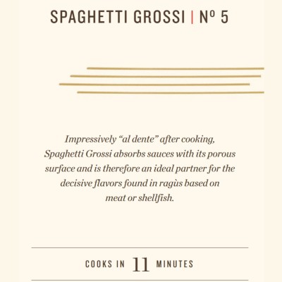 The Spaghetti Grossi shape, longer and thicker than standard spaghetti, adds character to your dishes and holds up wonderfully during cooking. It cooks in 11 minutes, maintaining its structure and flavour.